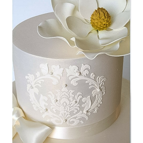 A két emeletes torta felső szintjén látható Filigrált Medál Stencil egymagában is megvásárolható ITT.