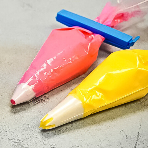 Műanyag habzsáklezáró csat habzsákos dekorálás megkönnyítéséhez. A csat használatával biztosak lehetünk abban, hogy a glazúr vagy vajkrém nem folyik majd ki a habzsák tetején, így a dekorációk elkészítésére összpontosíthatjuk figyelmünket.